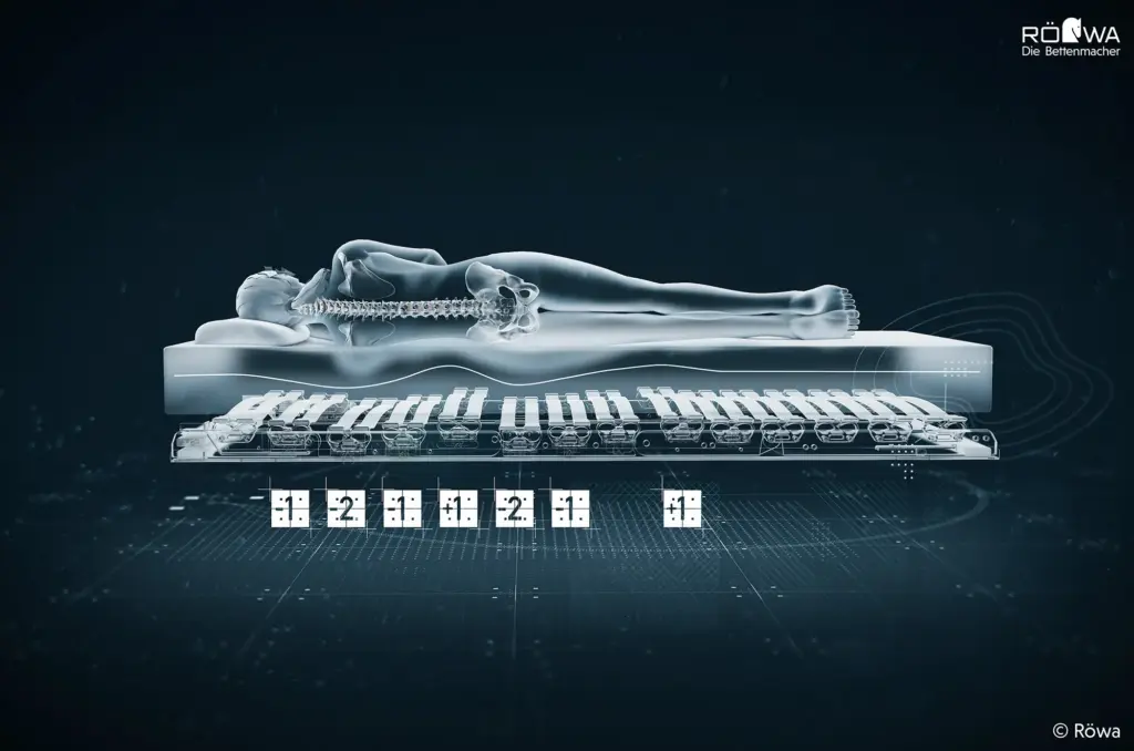 Der Lattenrost muss auf die anatomischen Anforderungen einstellbar sein und im Schulter-, Lordosen, Becken und Kniebereich unterstützend und entlastend die ergonomischen Funktionen der Matratze fortführen. Eine passende Unterfederung gibt physikalische Kräfte weiter und erhält die Spannkraft von unten.